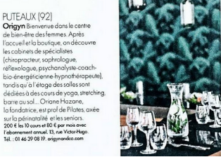 « PUTEAUX (92) Origyn Bienvenue dans le centre de bien-être des femmes. Après l’accueil et la boutique, on découvre les cabinets de spécialistes (chiropracteur, sophrologue, réflexologue, psychanalyste-bio-énergéticienne-hypnothérapeute), tandis qu’à l’étage des salles sont dédiées à des cours de yoga, stretching, barre au sol… Oriane Hazane, la fondatrice, est prof de Pilates, axée sur la périnatalité et les seniors. »